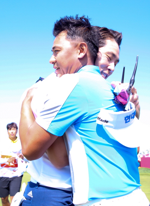 박상현프로 우승축하 포옹을 하고 있는 최진호프로