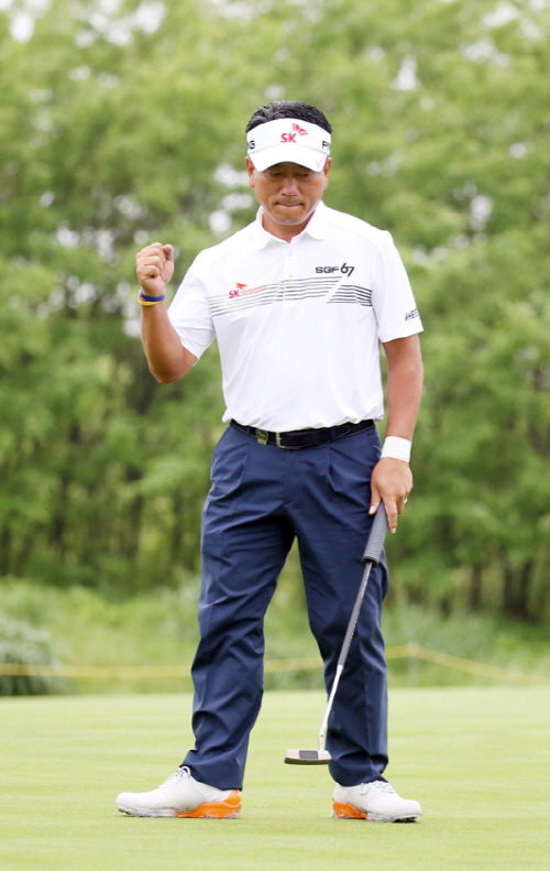 8번홀 버다 퍼팅 성공후 세레머니를 하고있는 최경주